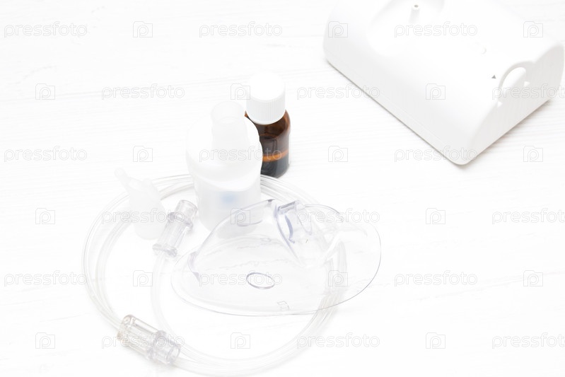 Небулайзер и аксессуары для него на светлом фоне, пространство для копирования, ингалятор и маска, лекарство для ингаляций, тип компрессора