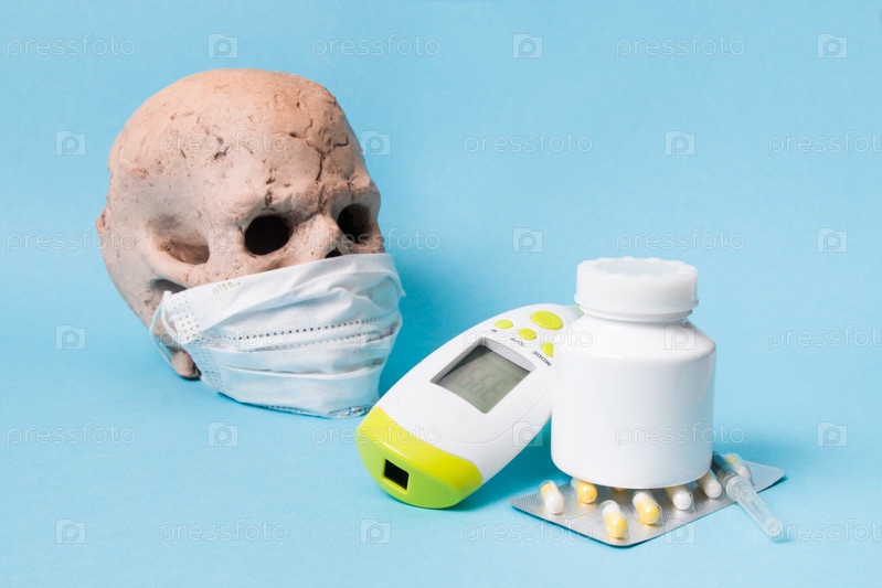 Таблетки, наркотики, шприц, инфракрасный бесконтактный термометр и керамический череп в защитной медицинской маске на синем фоне, пространство для копирования, концепция высокой температуры