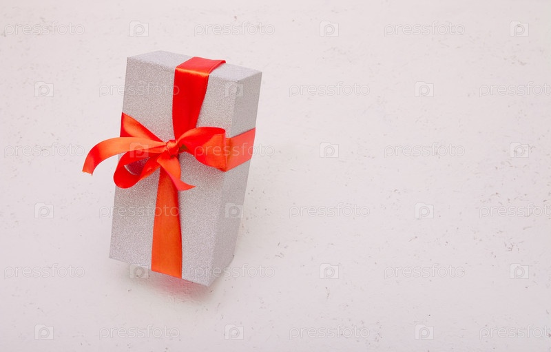 Летающая блестящая подарочная коробка на белом фоне с красным бантом