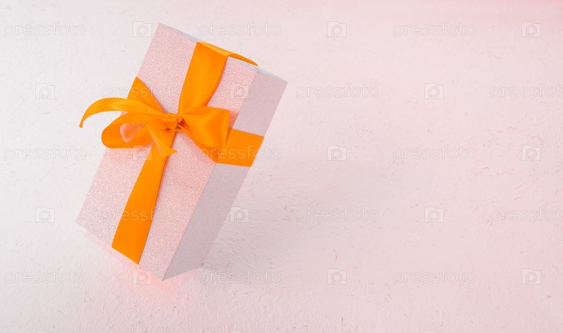 Падающая блестящая подарочная коробка на светлом фоне с золотым бантом