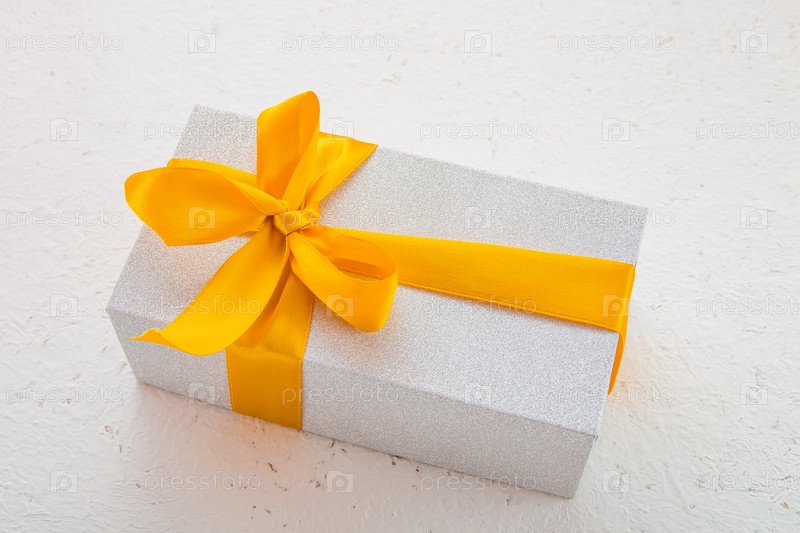 Блестящая подарочная коробка с золотым бантом на белом фоне