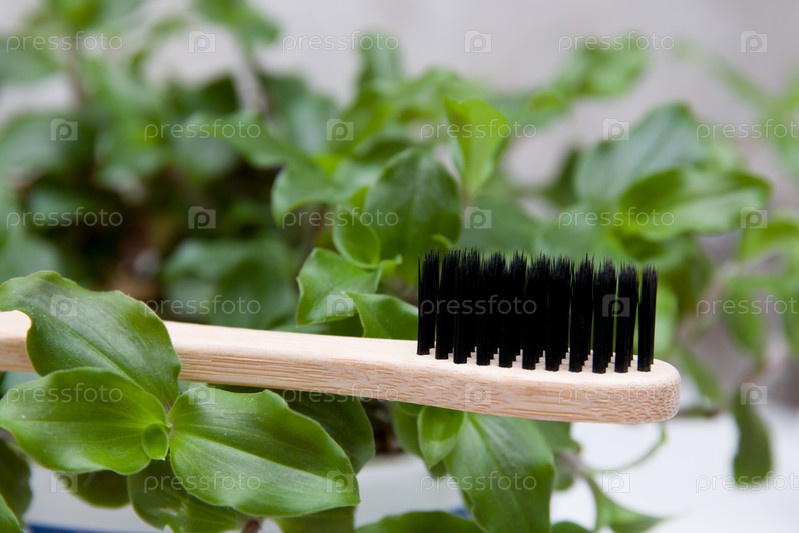 Бамбуковая зубная щетка на листьях трава зеленая, цветок, дружелюбная экологическая концепция, ноль отходов, жизнь без пластика
