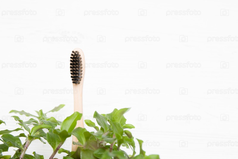 Бамбуковая зубная щетка в листьях трава зеленая, цветок, дружественная экологическая концепция, ноль отходов, жизнь без пластика, пространство для копирования