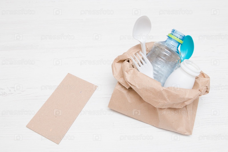 Картонная тарелка для вашей надписи и мешок мусора для переработки, экологически чистая концепция
