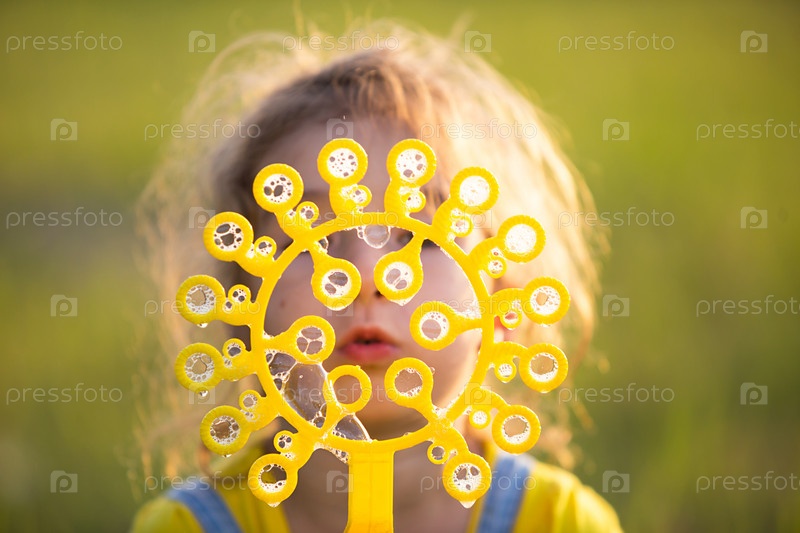 Девушка в джинсовом комбинезоне пускает мыльные пузыри летом в поле на закате. Международный день защиты детей, счастливый ребенок, мероприятия на свежем воздухе. Летний фон. Здоровый и экологичный образ жизни