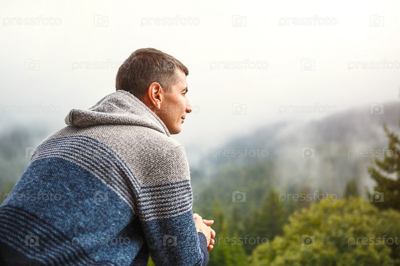 Молодой человек утром смотрит с балкона отеля с видом на горы, туман и еловый лес. Вид на горы с высоты дома. Наслаждайтесь видом, доброе утро, свежий воздух