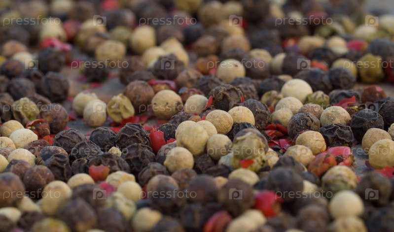 Макроснимок смеси черного, белого и красного перца - ароматная специя. Экстремальный крупный план
