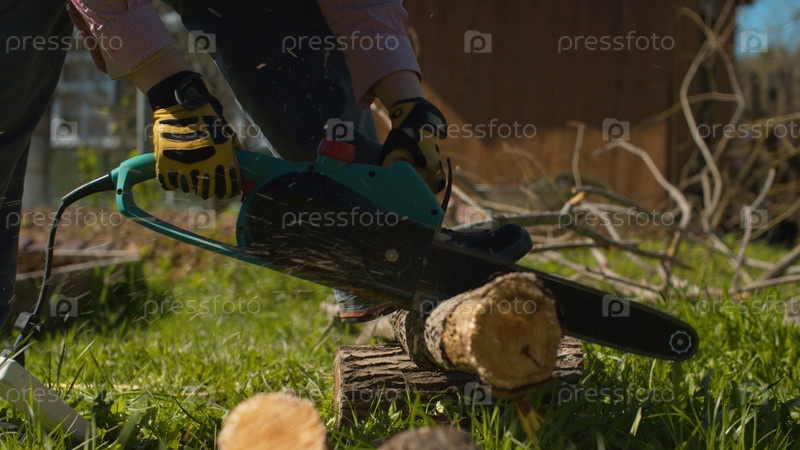 Руки женщины рубят дерево во дворе