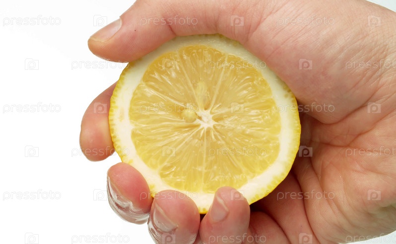 Крупным планом мужская рука сжимает лимон на белом фоне