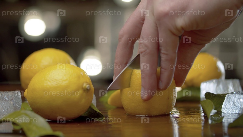 Крупным планом мужская рука режет лимон на дольки на столе на фоне размытых лампочек. Приготовление освежающих напитков. Бармен работает крупным планом
