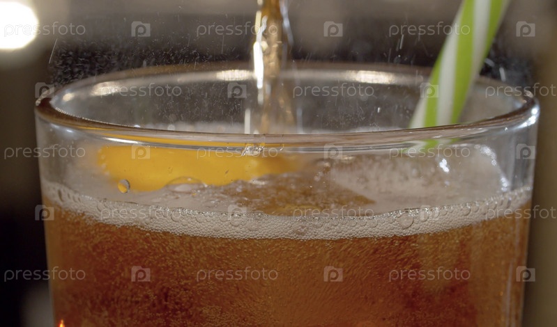 Закройте сладкую газированную воду, льющуюся в стакан. Газированный напиток со льдом и лимоном в стакане на фоне размытых огней. Газ выходит из стекла, капли хорошо видны в контровом свете