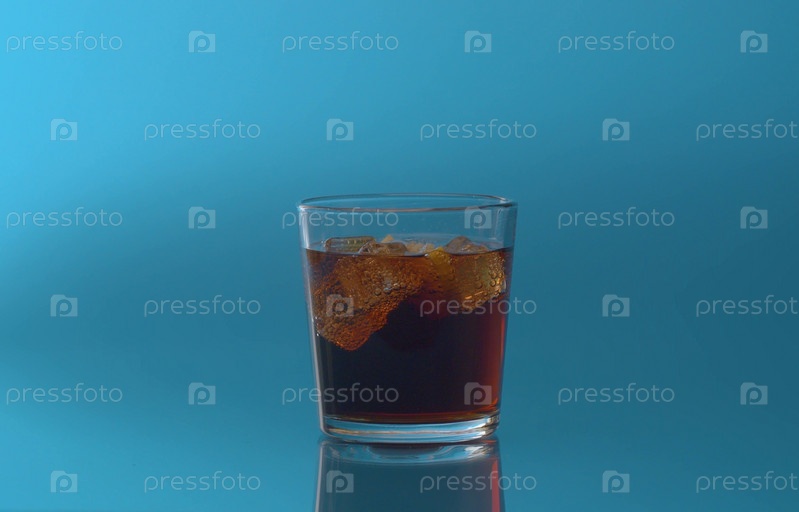 Стакан колы со льдом и лимоном крупным планом. Кола шипучий напиток с кубиками льда и нарезанным лимоном в прозрачном стакане на синем фоне. Кока-кола с пузырьками крупным планом