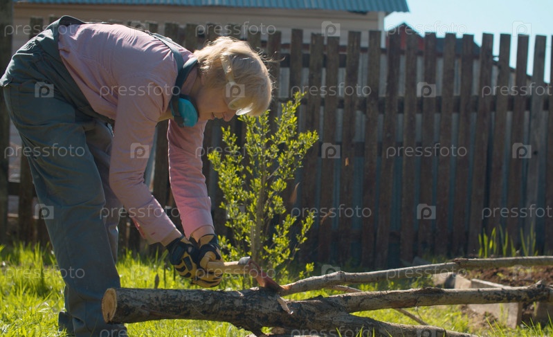 Зрелая женщина рубит топором