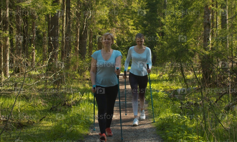 Женщины с треккинговыми палками в лесу