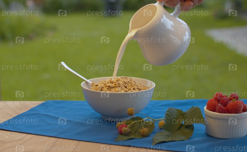 Молоко льется в миску с мюсли