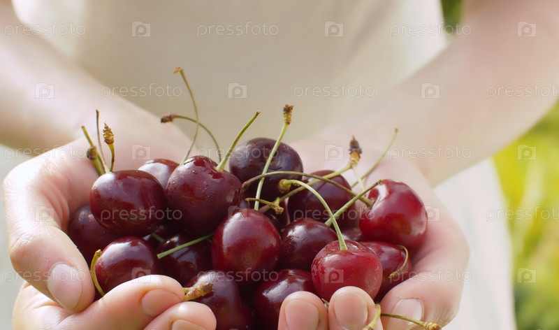 Спелая вишня в женских руках