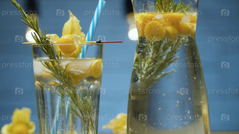 Холодный газированный напиток из розмарина и физалиса в стеклянном кувшине на синем фоне