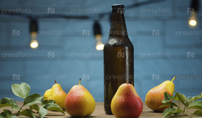Запотевшая бутылка сидра и груш