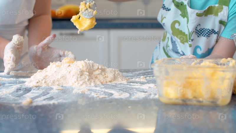 Закройте руки двух детей, вместе готовящих выпечку на яркой кухне
