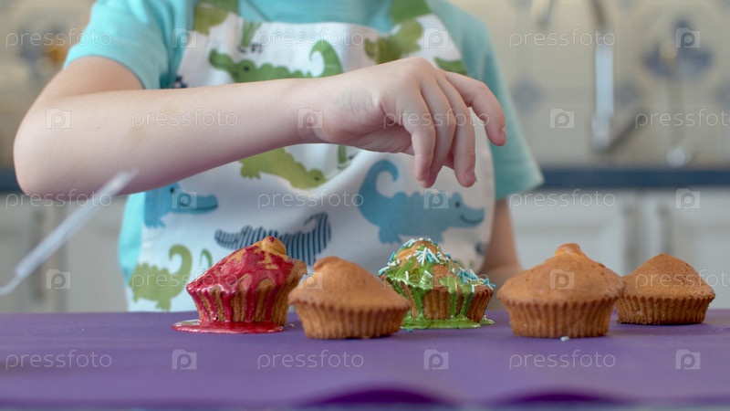 Детская рука украшает кексы