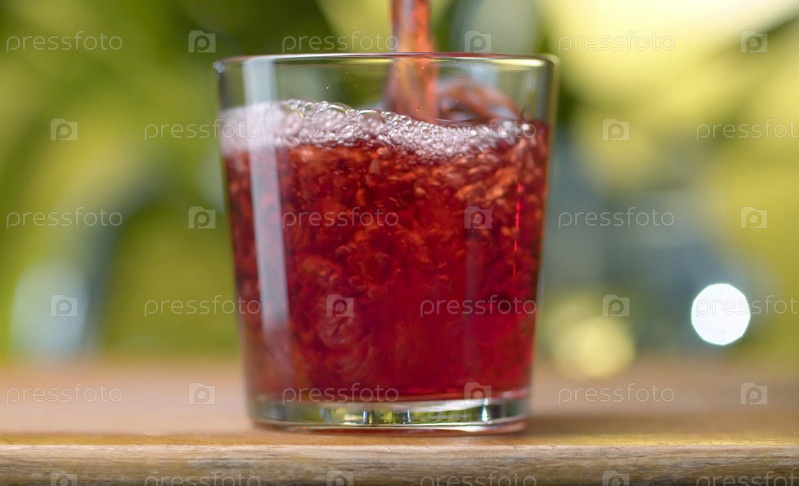 Красный прозрачный сок или вино, льющееся в стакан с брызгами и пузырьками на естественном зеленом фоне. Закройте вишневый или гранатовый или клюквенный сок или вино. Концепция здорового питания