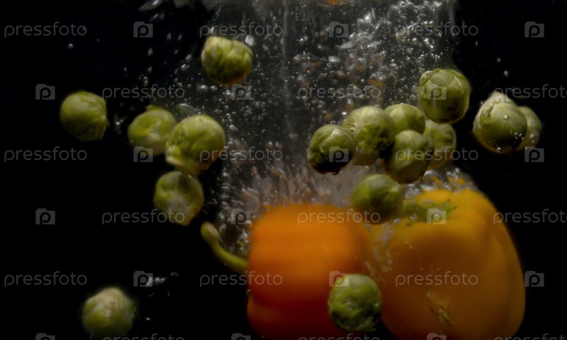 Брюссельская капуста и паприка падают в воду с брызгами и пузырьками