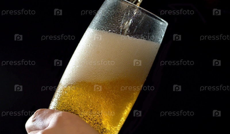 Крупным планом пиво льется в запотевшее стекло на черном фоне. Пузыри поднимаются вверх и красиво сияют в луче света