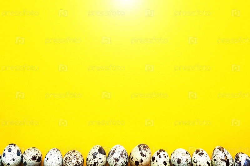 Пасхальный весенний фон с яйцом. Пятнистые перепелиные яйца на желтом фоне по нижней границе кадра. Копирование пространства, баннер