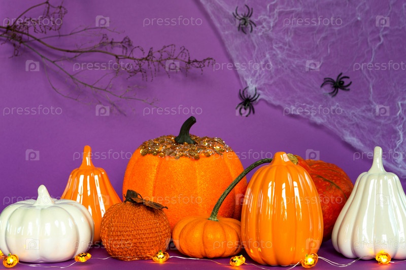 Хэллоуинские фоны из белых, оранжевых и золотых тыкв, пауков и сухих веток на фиолетовом фоне с паутиной и ужасным декором. Ужас и страшный праздник