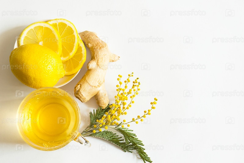 Травяной чай в чашке, имбирь, лимон и акация - укрепляют иммунитет в холодное время года. Аллергия, лихорадка, грипп. Витаминный напиток для здоровья и ингредиенты на белом фоне. Скопируйте пространство, ровно