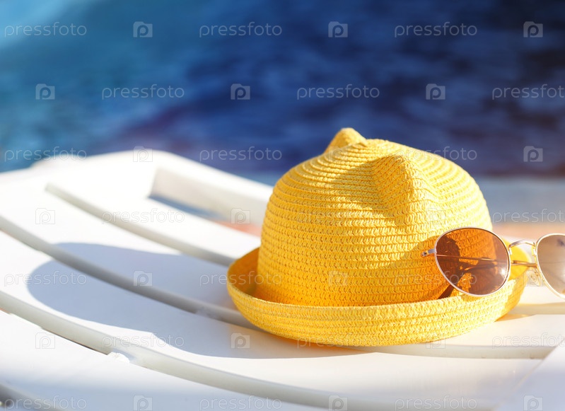 Пляжные аксессуары желтая шляпа и солнцезащитные очки лежат на белом шезлонге у бассейна. Защита от солнца, УФ, загар, путешествия. Концепция отдыха, морская прогулка, плавание. Скопируйте пространство. Флэтлей
