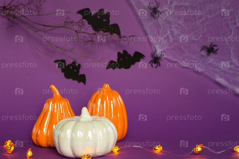 Хэллоуинские фоны из белых, оранжевых и золотых тыкв, пауков и черных летучих мышей на фиолетовом фоне с паутиной и ужасными пейзажами. Ужас и страшный праздник с копией пространства