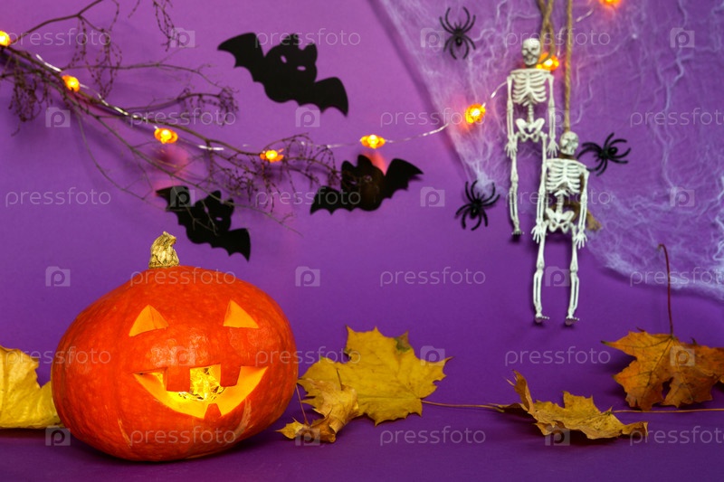 Хэллоуин фон из тыквы фонаря Джека, паутины, скелета на веревке, пауков и черных летучих мышей на фиолетовом фоне с ужасными пейзажами. Ужас и страшный праздник с копией пространства