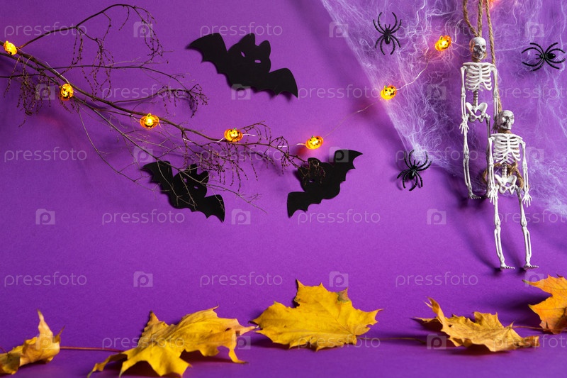 Хэллоуин фон из тыквы Джека фонарь, светящаяся гирлянда, паутина, скелет на веревке, пауки и черные летучие мыши на фиолетовом фоне с сухими желтыми листьями. Ужас и страшный праздник