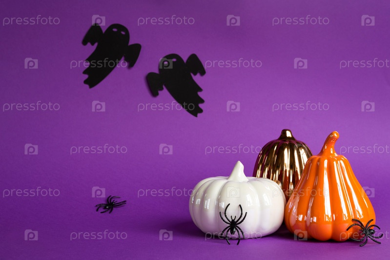 Хэллоуинские фоны из белых, оранжевых и золотых тыкв, пауков и черного призрака на фиолетовом фоне с паутиной и ужасными пейзажами. Ужас и страшный праздник с копией пространства