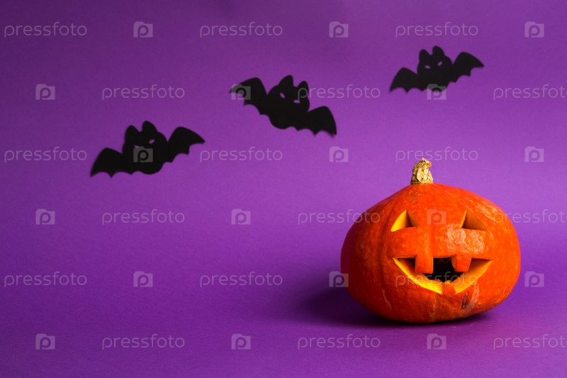 Хэллоуин фон из тыквы, пауков и черных летучих мышей на фиолетовом фоне с ужасными пейзажами. Ужас и страшный праздник с копией пространства