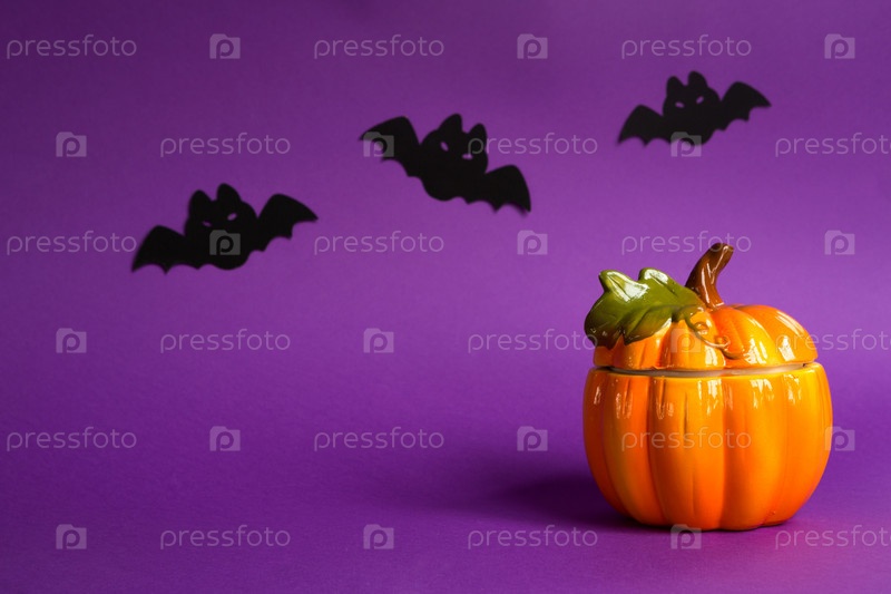 Хэллоуинские фоны из белых, оранжевых и золотых тыкв, пауков и черных летучих мышей на фиолетовом фоне с паутиной и ужасными пейзажами. Ужас и страшный праздник с копией пространства