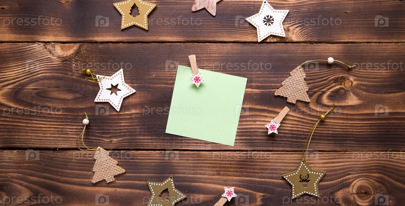Рождественская плоская планировка деревянных звезд, елей и прищепок на темном фоне с квадратным листом для заметок в центре. Новогодняя рамка, место для текста. Новогодние игрушки, список дел, открытка