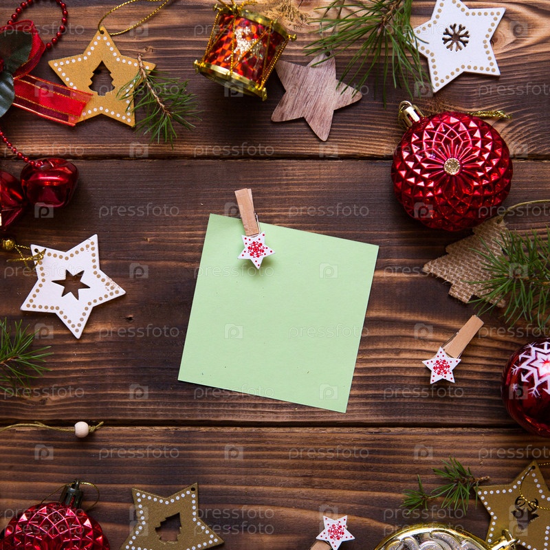 Рождественская плоская планировка из красных воздушных шаров, деревянных звезд и прищепок на темном фоне с квадратным листом для заметок в центре. Новогодняя рамка, место для текста. Новогодние игрушки, бусы, сосновые ветки