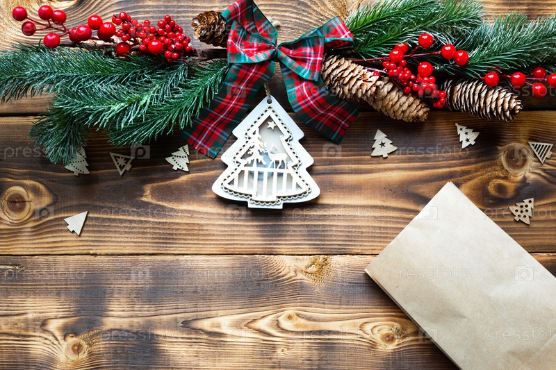 Рождественский декор бумажного пакета службы доставки еды на столе. Предновогодняя акция. Готовый заказ, экологически чистая перерабатываемая упаковка. Работа по организации питания в праздничные дни. Скопируйте пространство, макет