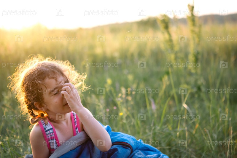 Девушка недовольна царапинами от укусов комаров, ребенок спит в спальном мешке на траве в походе. Экологичный отдых на природе, летнее время. Нарушение сна, отталкивающий