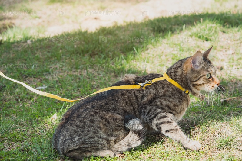 Выгуливание домашней кошки на желтой шлейке. Полосатый кот боится улицы, прячется в зеленой траве с опаской и любопытством. Учим питомца ходить