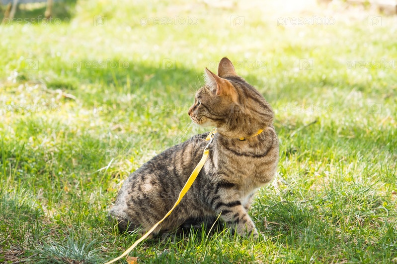 Выгуливание домашней кошки на желтой шлейке. Полосатый кот боится улицы, прячется в зеленой траве с опаской и любопытством. Учим питомца ходить
