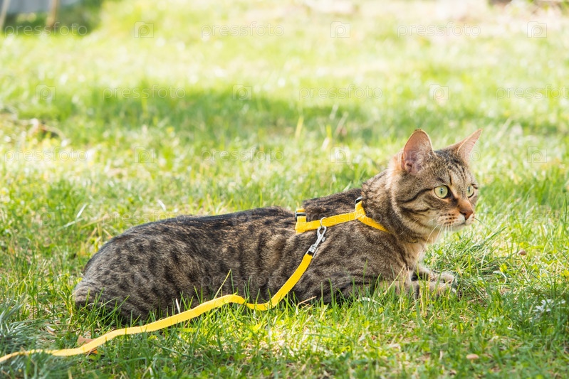 Выгуливание домашней кошки на желтой шлейке. Полосатый кот боится улицы, прячется в зеленой траве с опаской и любопытством. Учим питомца ходить