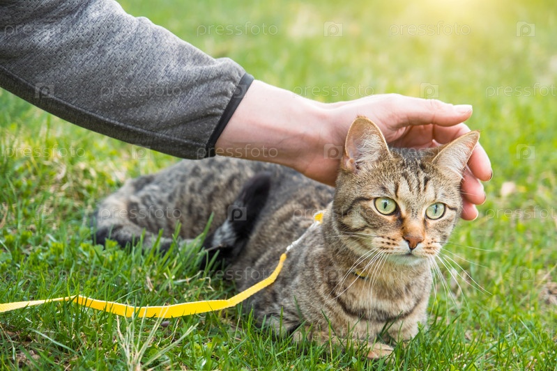 Прогулка домашней кошки с хозяином на желтой шлейке. Полосатый кот, лаская руку человека на улице, прячется в зеленой траве, осторожно и с любопытством. Учим питомца ходить