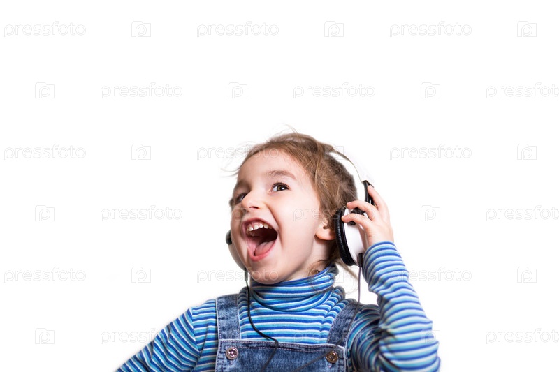 Маленькая девочка в полосатой синей водолазке слушает музыку в белых наушниках и громко поет с открытым ртом. Веселье, крики, детские эмоции. Белый фон, изолировать, копировать пространство