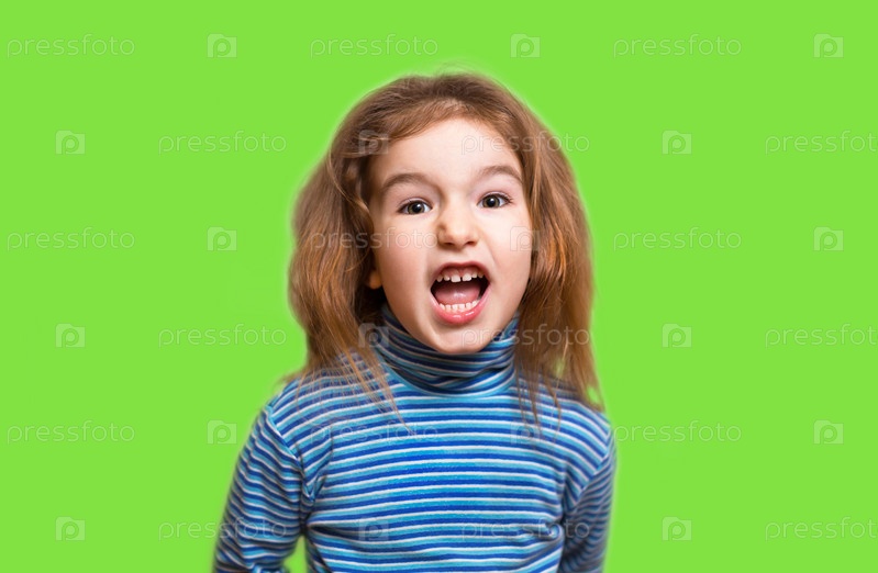 Маленькая кавказская девочка в синей полосатой водолазке от возмущения открыла рот и скривила лицо, сморщив нос. Отрицание, неприятное, возмущение, тьфу, отвратительное. Зеленый фон, копирайт
