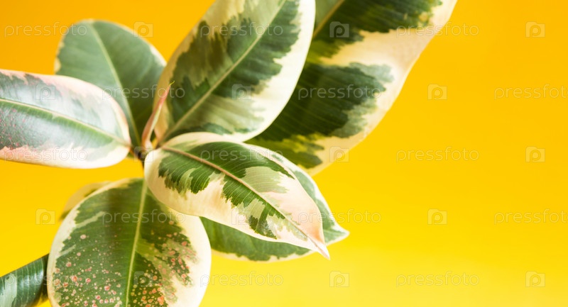 Крупный план листьев фикуса каучукового пестрого с открытием бутона с новым молодым листом на желтом фоне. Уход за домашними растениями, выращивание, полив и удобрение. Абиджан, сорт эластика, Белиз