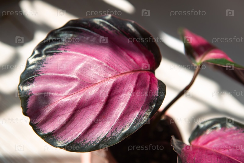 Calathea roseopicta Dottie, розовый лист в крупном плане на подоконнике при ярком солнечном свете с тенями. комнатные растения в горшках, зеленый домашний декор, уход и выращивание, сорта маранто