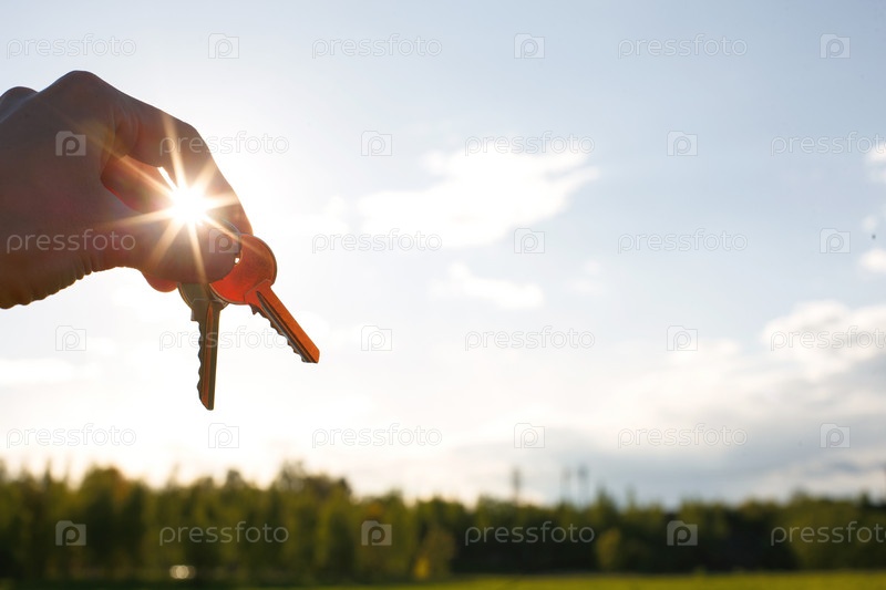 Белая деревянная фигура дома и ключи в руке на фоне неба и поля. Мечта о своем доме, строительство коттеджа в деревне, план и дизайн, сдача проекта, переезд в новый дом